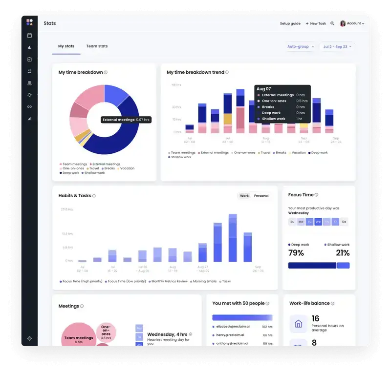 Moreover, Reclaim offers insights into work patterns, suggests designated no-meeting days, and adjusts task durations, helping you refine your time management efforts even further.