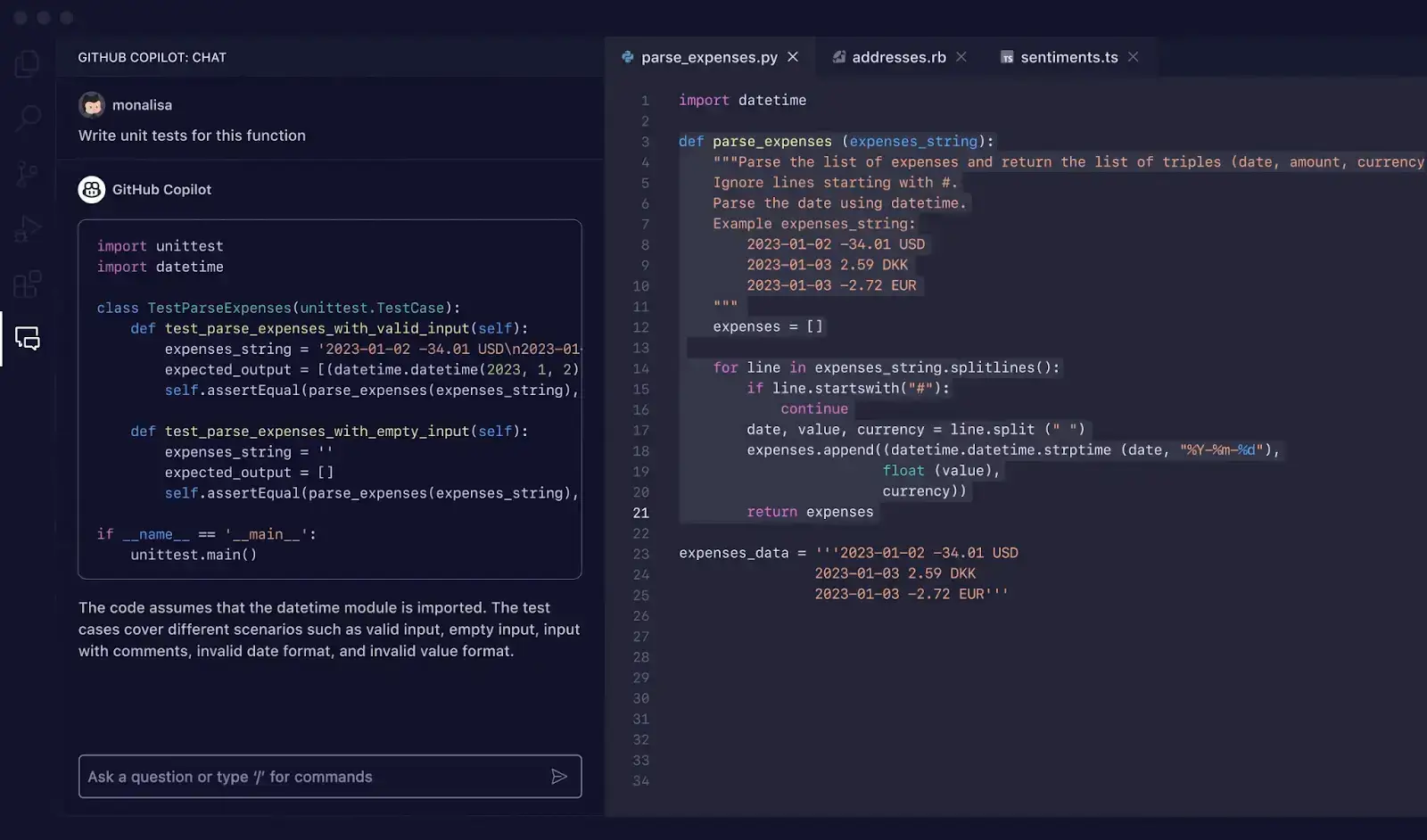 - Code completion: You begin writing code, and GitHub Copilot suggests completions, potentially filling in entire lines or functions.