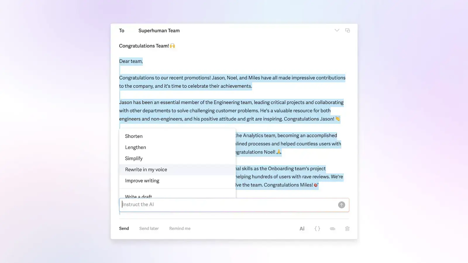 Compatible with both Gmail and Outlook, Superhuman integrates smoothly to help teams accelerate their pace, respond more quickly, and reduce overall stress.