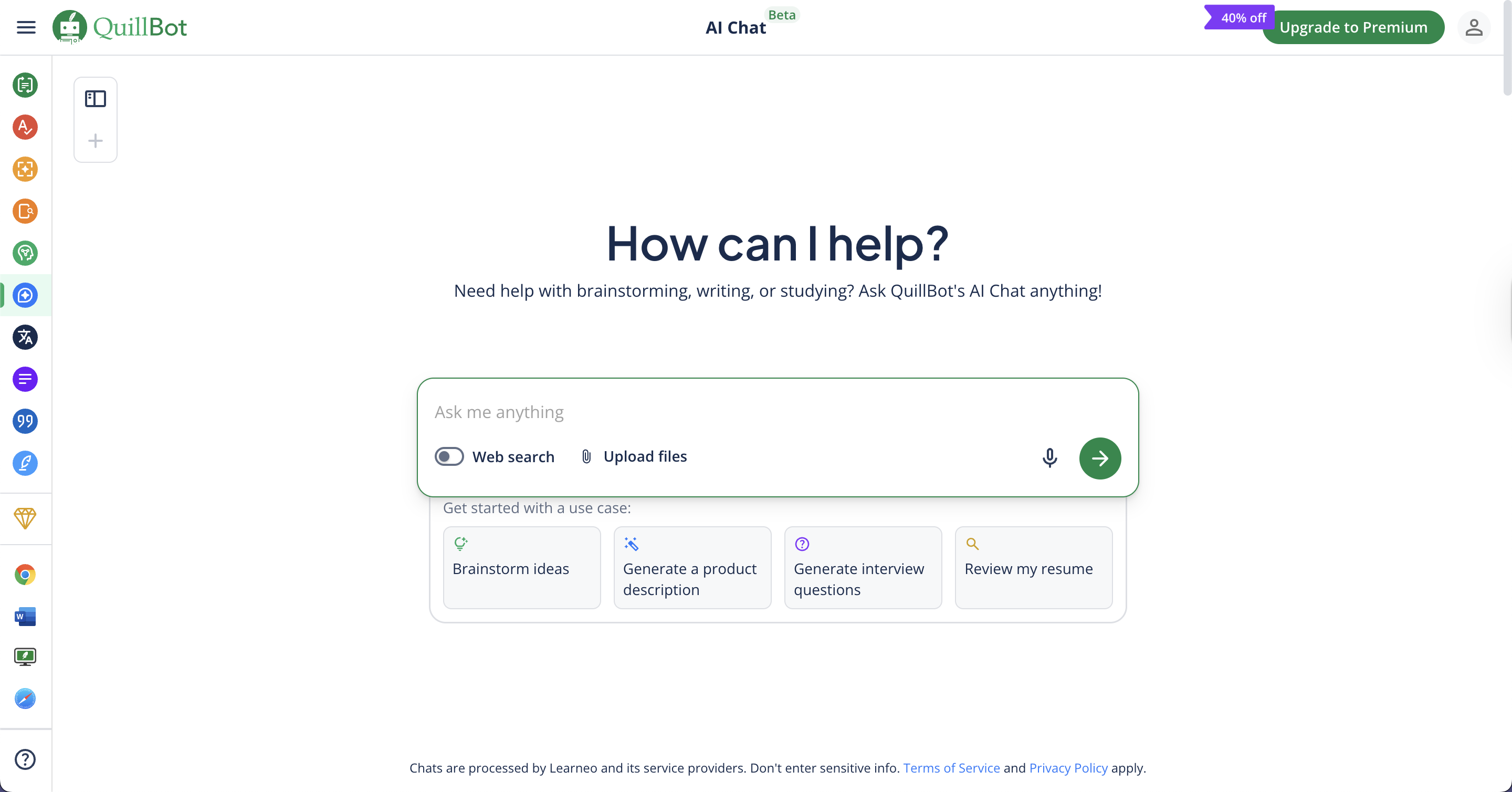 QuillBot’s AI Chat works as both a personal AI-assistant and a research companion. As your personal assistant, it helps with everyday tasks like drafting emails, preparing reports, or polishing essays, so your writing is clear and professional. As your research companion, it supports deeper learning, breaks down complex ideas, explains concepts step by step, and summarizes information. Here are QuillBot’s two main modes of operation: