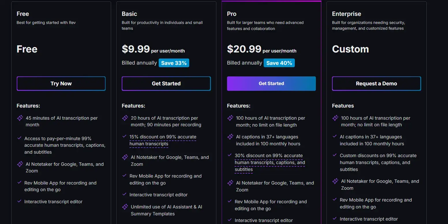 Finally, Rev offers an Enterprise plan for larger businesses with custom pricing.