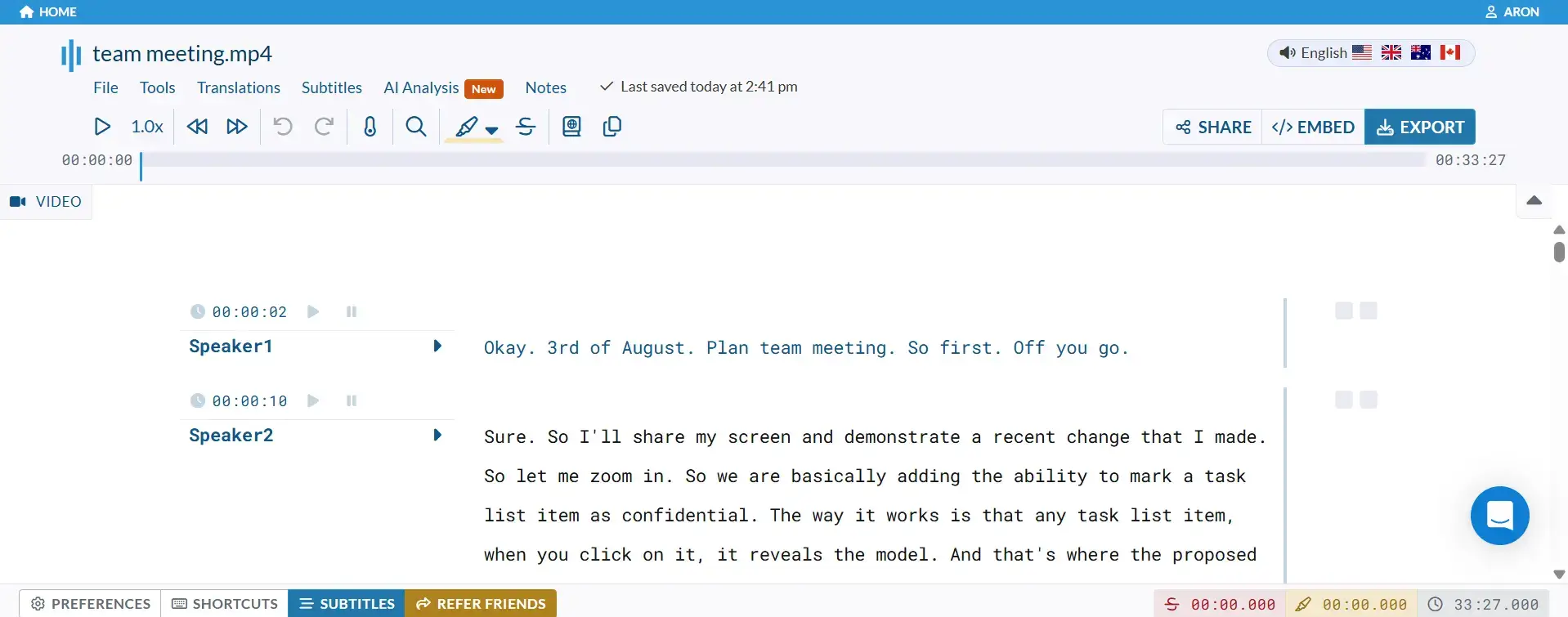 Sonix uses speaker labels to divide up the transcription. It has a transcription editor feature that you can access when you click on a specific part of the transcript.