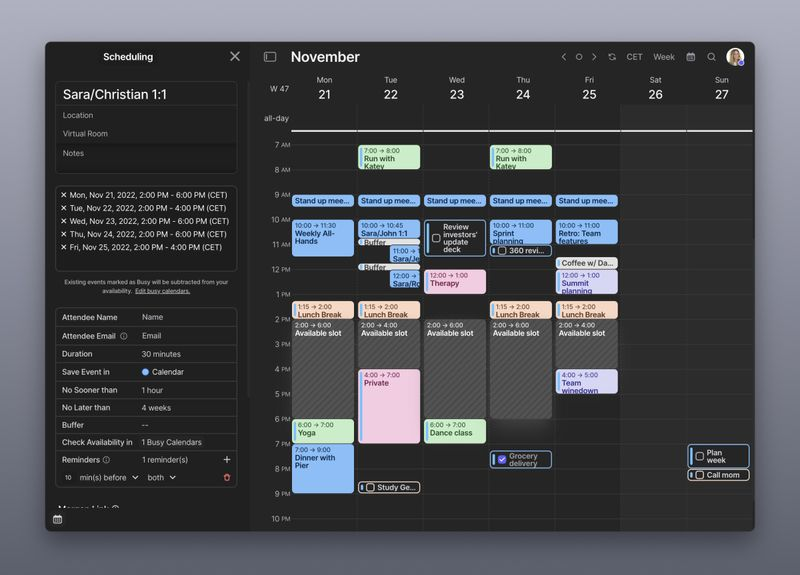 There are many impressive features to appreciate about SavvyCal. These include the functionality of calendar overlays, the presentation of availability windows in a specific order, the ability to customize on the fly, and more.