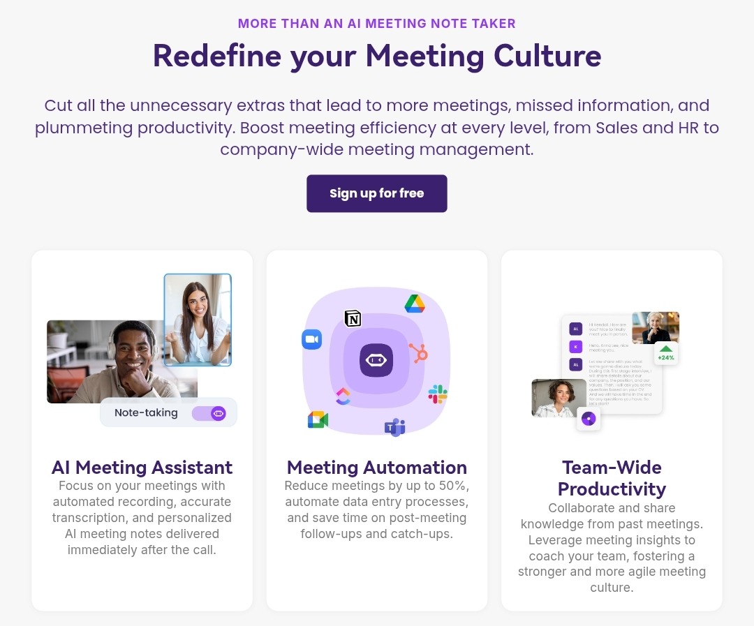 • It integrates with major meeting tools like Zoom, Google Meet, and Teams.