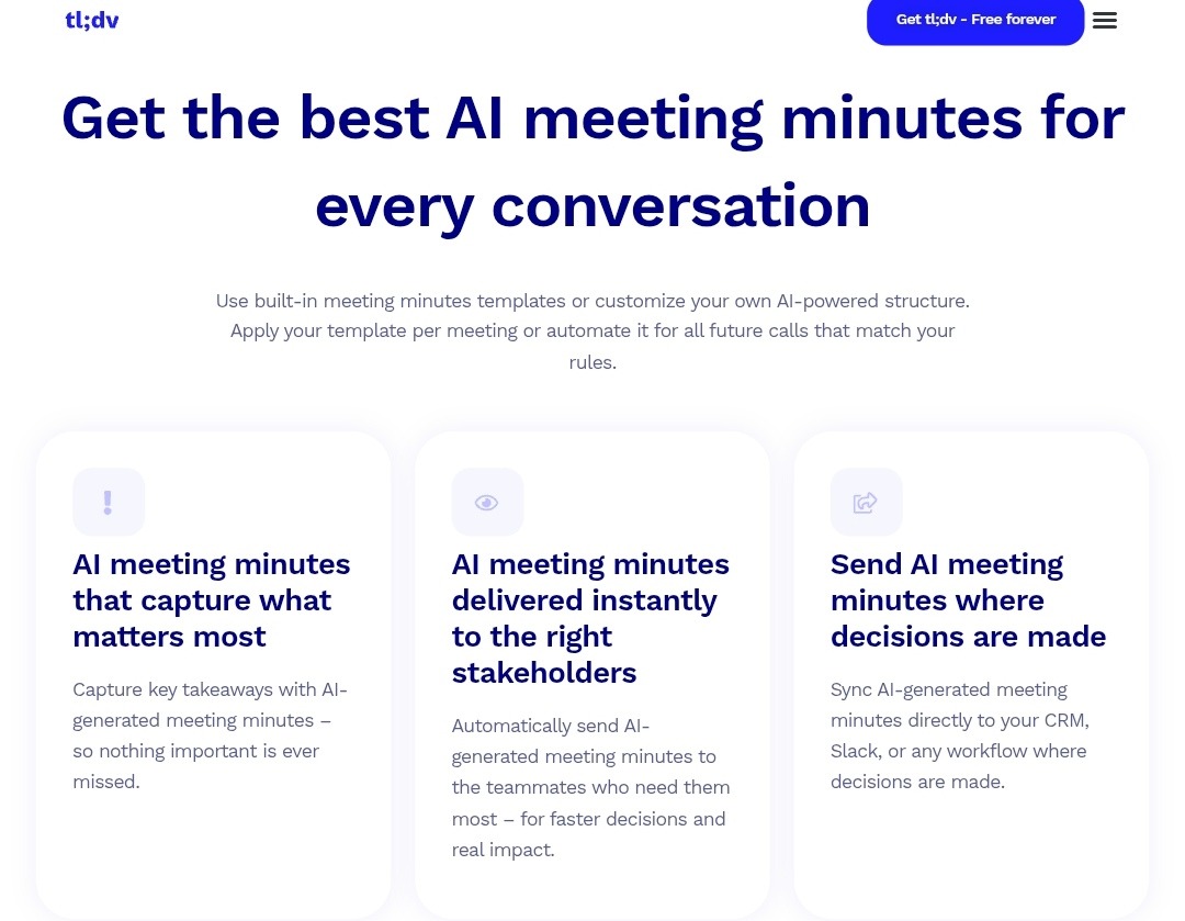 tl;dv’s strength as a meeting tool lies in supporting teams that rely heavily on video content, such as onboarding, sales demos, or product walkthroughs. It automatically captures both video and audio, but instead of just a transcript, tl;dv gives you highlights, clips, and a searchable library.
