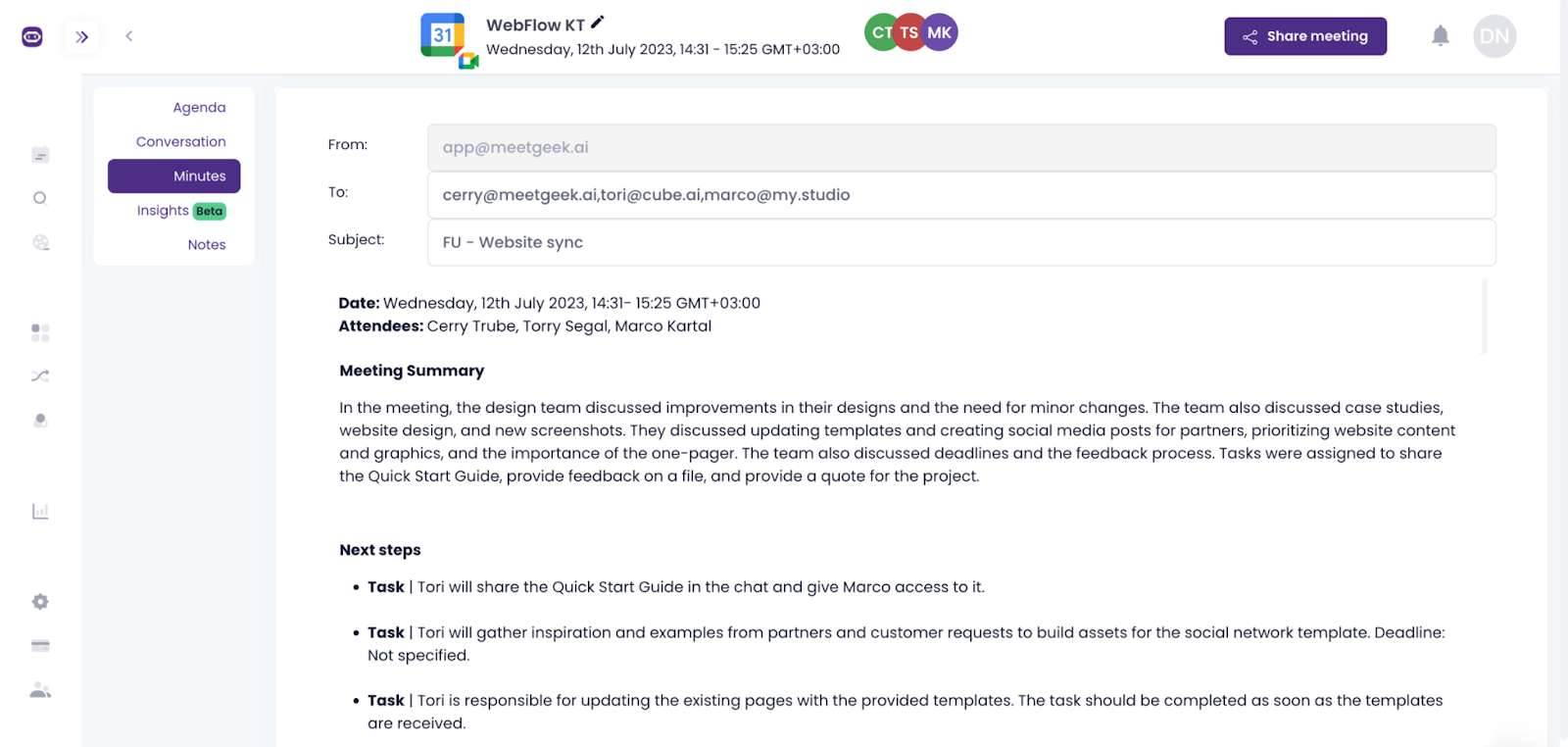 Manually creating meeting notes and sending them to each direct report is a tedious task. To optimize the entire process, take a step back and let MeetGeek automatically do that for you.