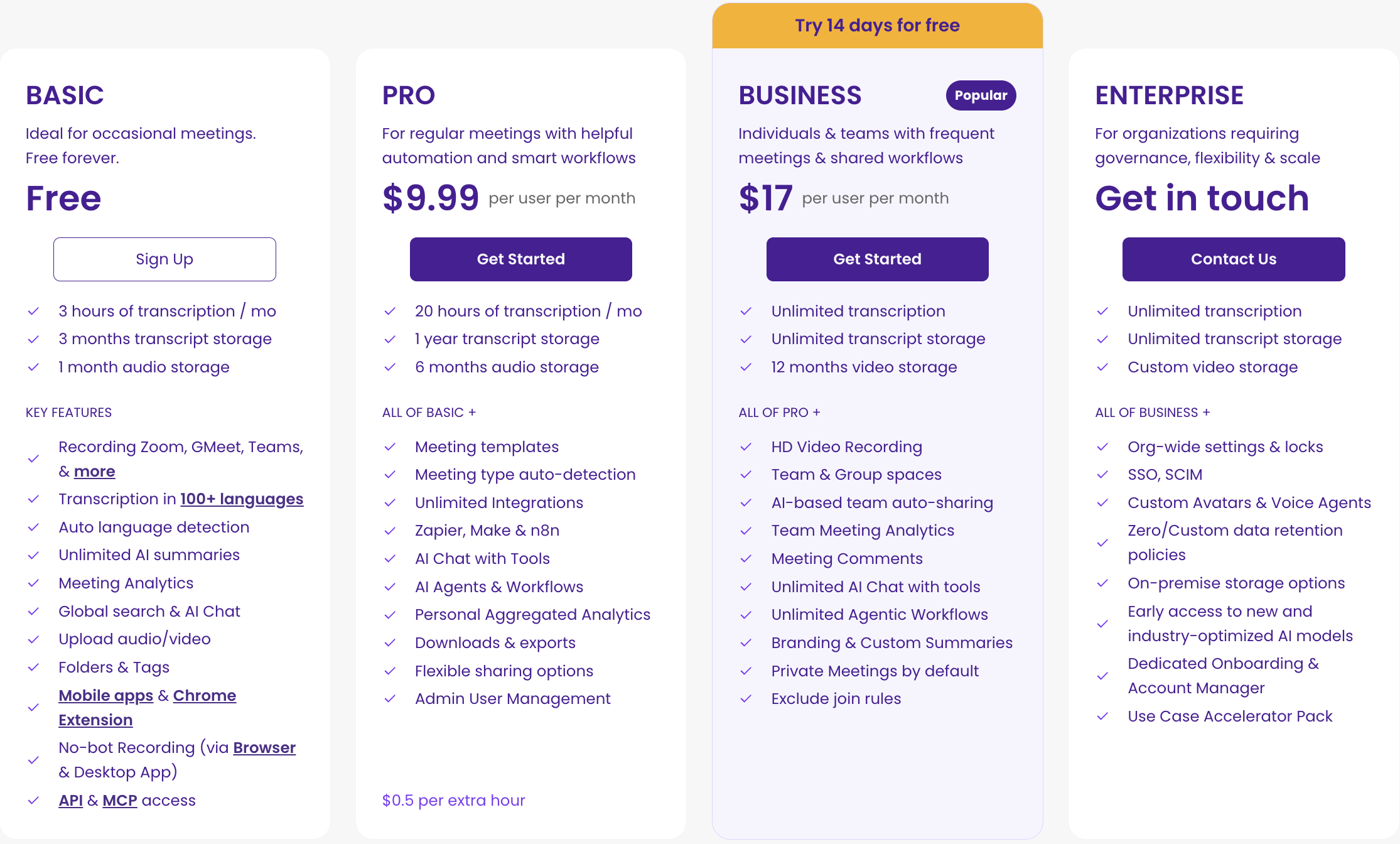 The Business plan was designed for teams and individual professionals who want the full MeetGeek experience with unlimited transcript storage and unlimited hours of recording. With this subscription, you will access team collaboration features and personalization functionalities for $17 per user monthly.