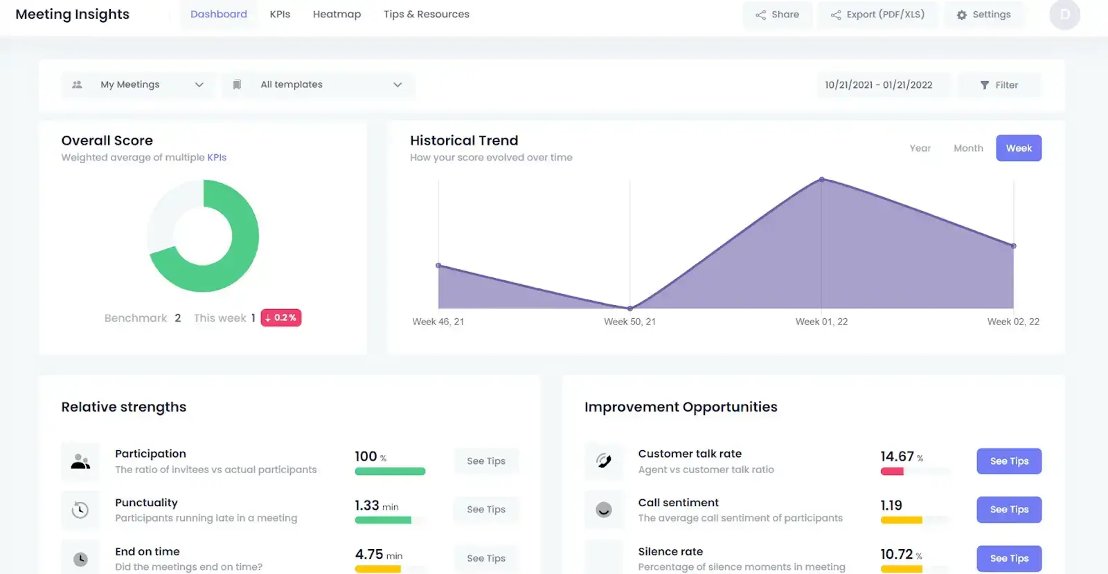 - Meeting insights: To understand whether your talk tracks are good enough, assessing their performance is mandatory. MeetGeek records your sales meetings and generates powerful meeting insights that you can use to quantify the success of your talk tracks and to coach your team on their weak points.
