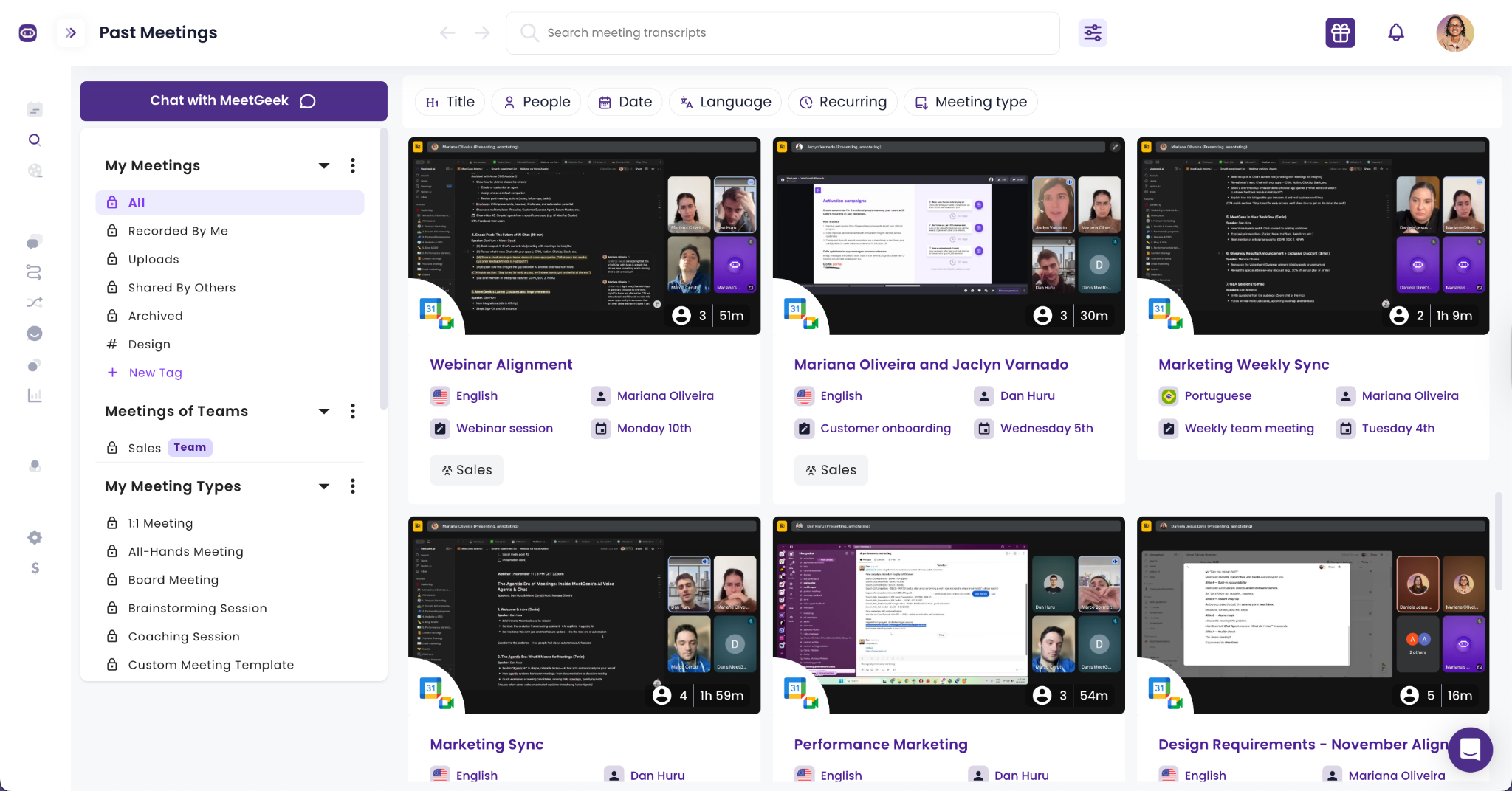 MeetGeek’s AI features also enhance searchability. Users can interact with past conversations through Chat With Meetings, a feature that lets them ask questions like “When did we discuss pricing?” or “What were the final requirements for the client project?” The AI retrieves relevant results across multiple meetings, saving hours of manual searching and ensuring that no detail is ever lost.