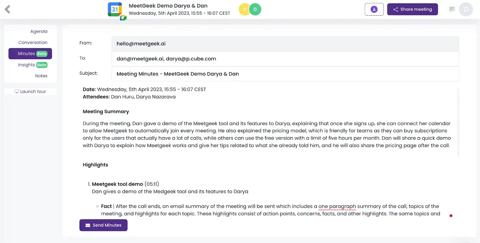 MeetGeek automatically syncs with your Google Calendar. It detects events with meeting links and automatically joins those calls once they begin. As soon as a meeting ends, you will receive the conversation recording, the automatic transcription, and the summary directly in your inbox.