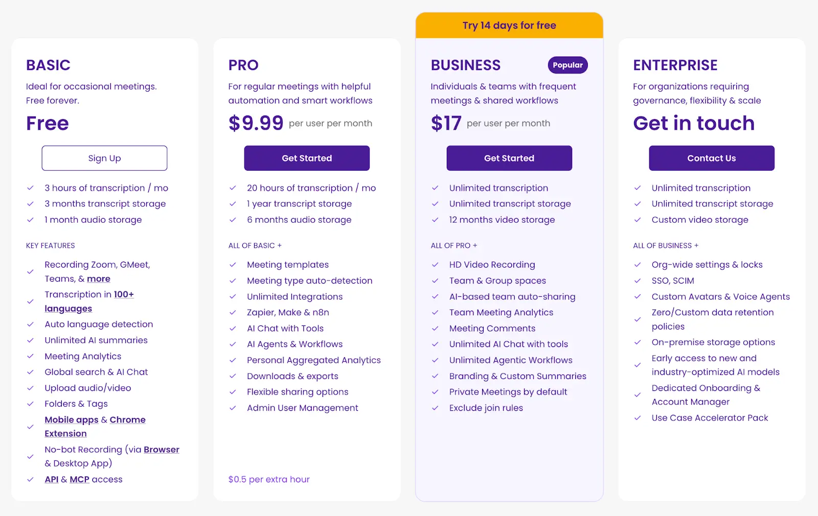 Wenn es um die kostenpflichtigen Tarife geht, können Sie die Pro-Plan für 18€. Dieser Plan eignet sich für Personen oder kleine Teams, die in einem Monat zahlreiche Besprechungen abhalten. Es beinhaltet alle Funktionen des kostenlosen Tarifs, einschließlich unbegrenzter Datei-Uploads, Aufforderungen, Besprechungsnotizen und Teamordner. Darüber hinaus können Sie mit dem Pro-Plan auf fast alle Integrationen von Drittanbietern zugreifen.