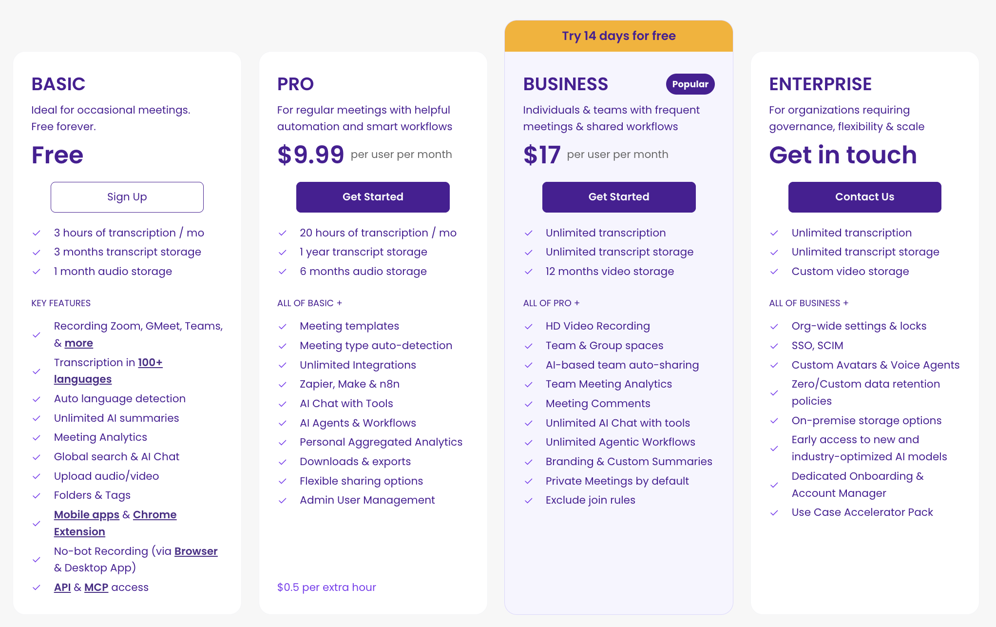 Wenn es um die kostenpflichtigen Tarife geht, können Sie die Pro-Plan für 18€. Dieser Plan eignet sich für Personen oder kleine Teams, die in einem Monat zahlreiche Besprechungen abhalten. Es beinhaltet alle Funktionen des kostenlosen Tarifs, einschließlich unbegrenzter Uploads, Aufforderungen, Besprechungsnotizen und Teamordner.