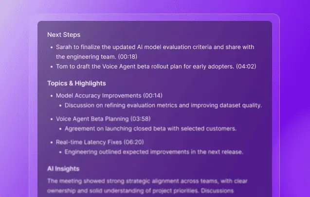 Get clean, organized notes with key decisions, tasks, and highlights—automatically generated after every meeting.