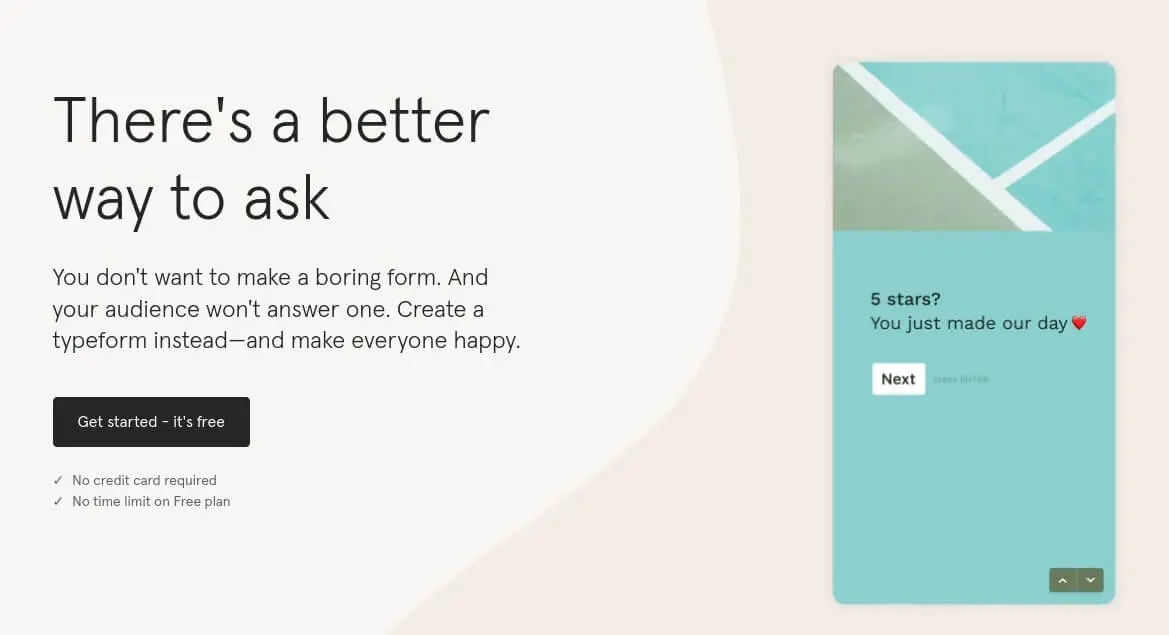 It also integrates with other tools like Google Sheets, Salesforce, Zendesk, and many more. Additionally, Typeform's analytics feature provides detailed insights into survey responses, making it easy to analyze and act on collected data. Typeform is designed to make it easy for users to create engaging, professional-looking forms and surveys that can be shared and distributed online.