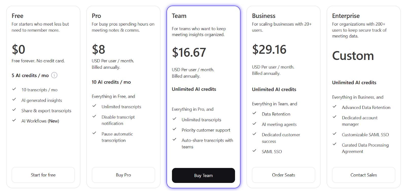 Team, Business, and Enterprise offer unlimited AI credits for AI summaries and automations across multiple meetings. Pro still caps you at 10 credits per month.