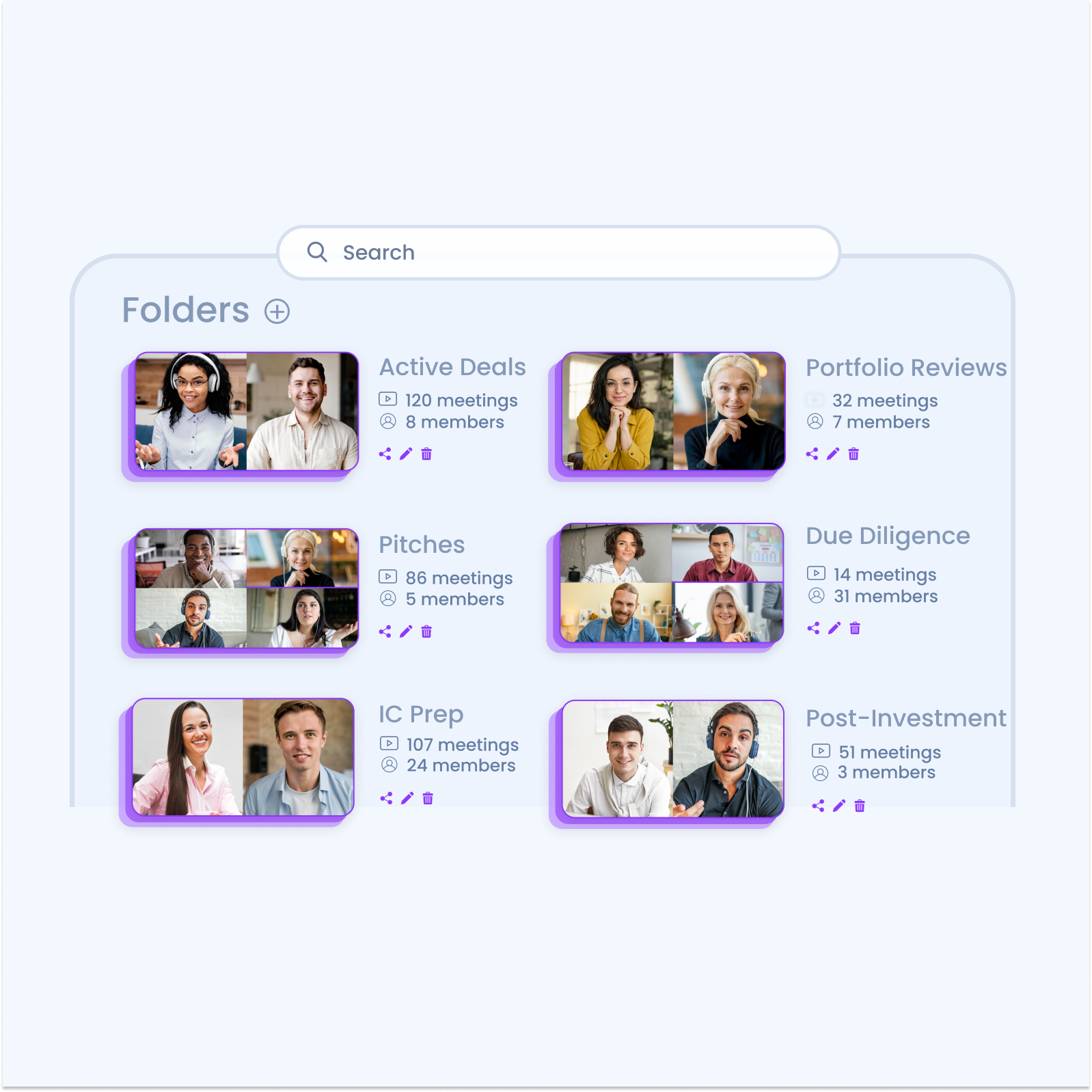Capture las llamadas de expertos, las referencias de clientes, las reuniones de socios y las revisiones internas; luego, busque por empresa, sector, etapa o tema para encontrar el momento exacto que necesita.