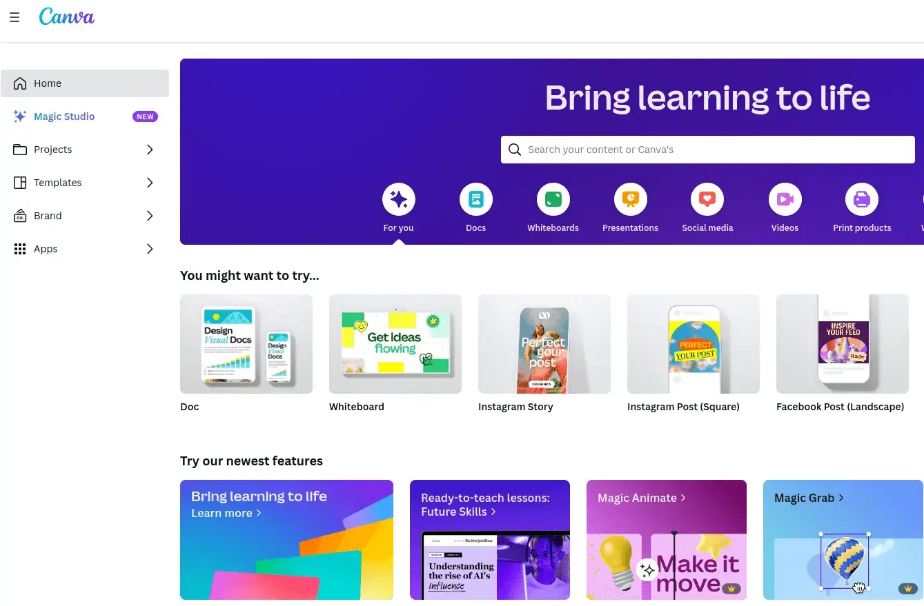Canva vous fournit un tableau blanc personnalisable qui peut vous servir de toile vierge. Vous pouvez utiliser cette plateforme pour discuter efficacement des idées innovantes et planifier facilement des activités.