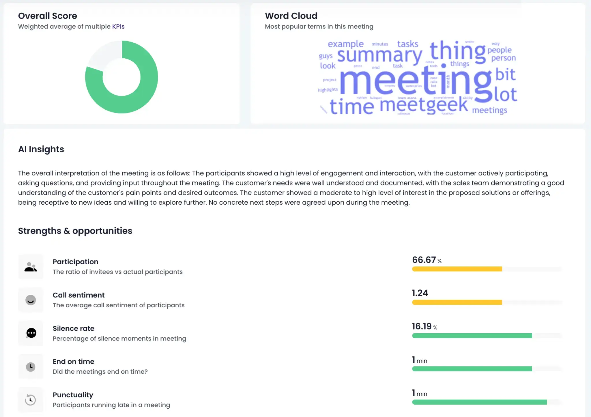 Si vous voulez réduire ces chiffres, MeetGeek a votre soutien. Les analyses de MeetGeek plongent profondément dans vos réunions, offrant des KPI comme le temps de parole, le sentiment d'appel, les taux de participation, et bien plus.