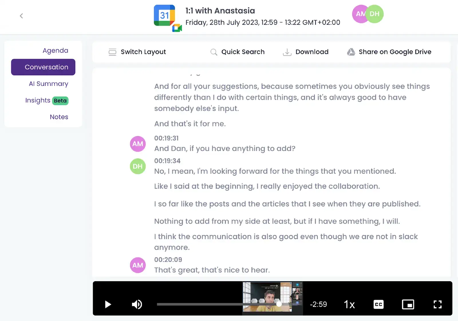 - Meeting repository: Whenever you need to revisit a one-on-one, MeetGeek acts as a centralized storage for all your meeting information. No more digging through scattered G Drive folders—everythingg is neatly organized and easily accessible.
