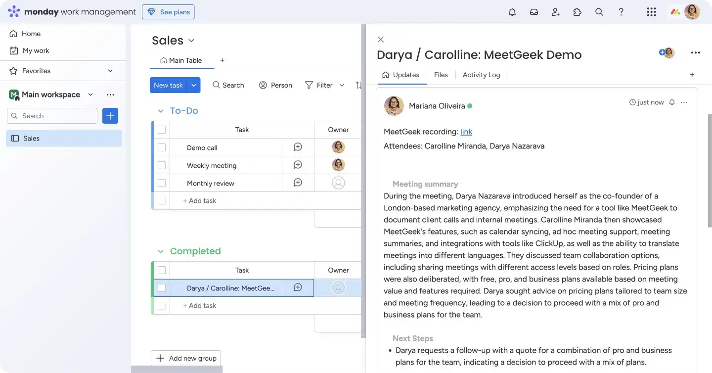 Use Monday to monitor progress and manage projects effectively with real-time data from MeetGeek.