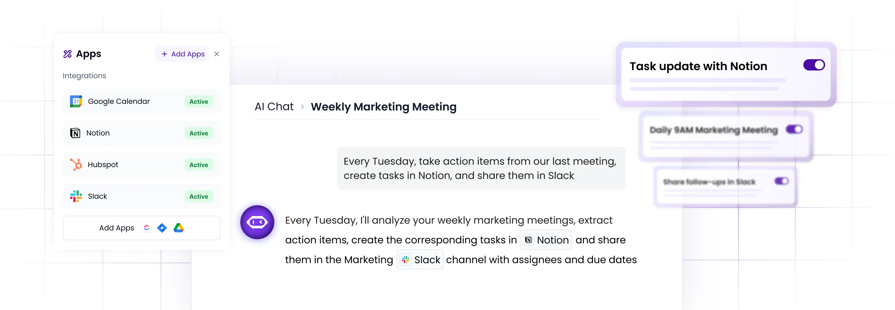 Imagine telling your AI assistant, “Send a report with due tasks from ClickUp every Monday,” or “Share meeting follow-ups in Slack” — and it just gets done.