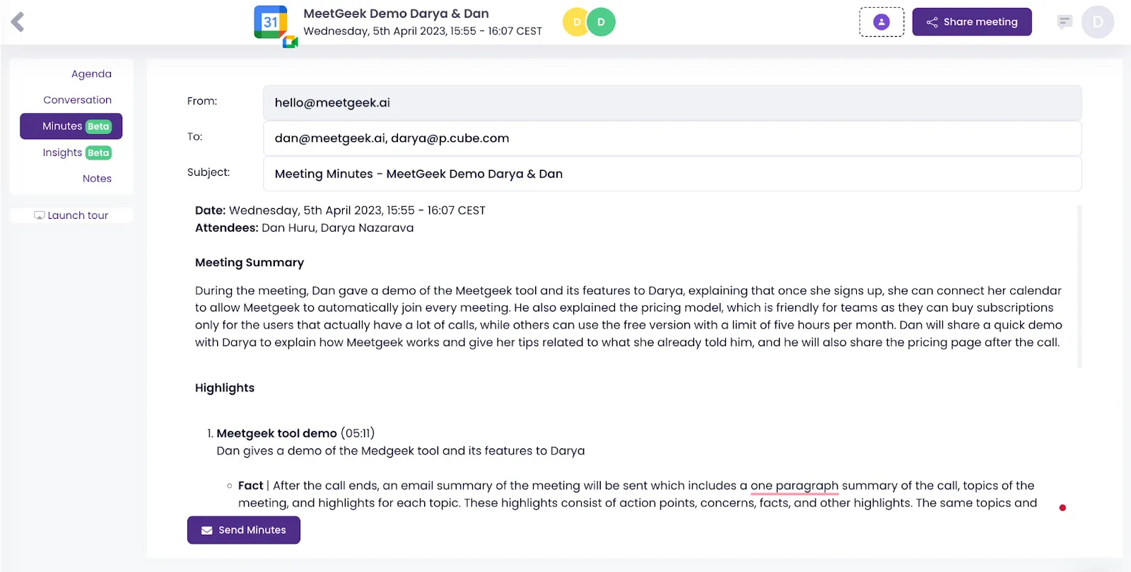 Além disso, você obtém destaques e insights das reuniões de sua equipe armazenados em sua conta e Atas de reuniões de IA entregue diretamente no seu e-mail!