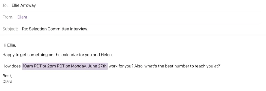 O que diferencia Clara é sua linguagem natural e coloquial, fazendo parecer que você está sendo atendido por um assistente humano. Isso é aprimorado ainda mais pela capacidade de detectar fusos horários e combinar a identidade da marca da sua empresa quando você muda o nome. Empresas líderes como Pinterest, Experiment, InVision, Noom, Plaid, Rubrik e Whirlpool usaram a Clara para economizar tempo e aprimorar os fluxos de trabalho.
