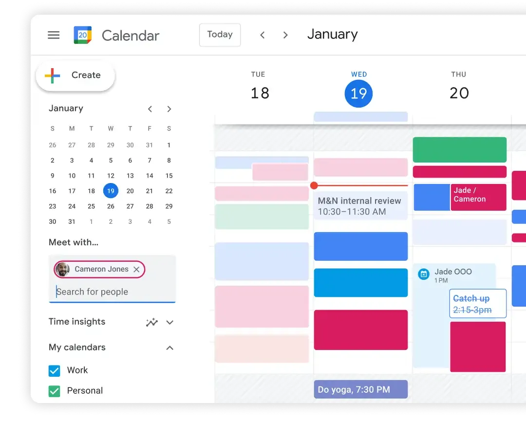 O recurso Encontre um horário do Google Agenda elimina todo o trabalho braçal do planejamento de reuniões, analisando os horários dos membros da sua equipe e destacando horários mutuamente convenientes. Basta adicionar seus convidados e deixar que o Find-a-Time faça o resto.