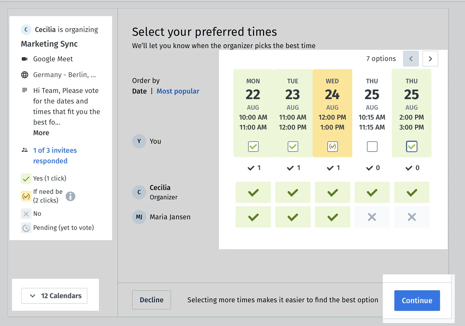 Você também pode sugerir várias datas e horários para seus convidados, para que eles possam escolher o que melhor atenda às suas necessidades. Além disso, você pode fazer uma enquete para a data e a hora da reunião com seus convidados e converter facilmente o horário mais votado em uma reunião.