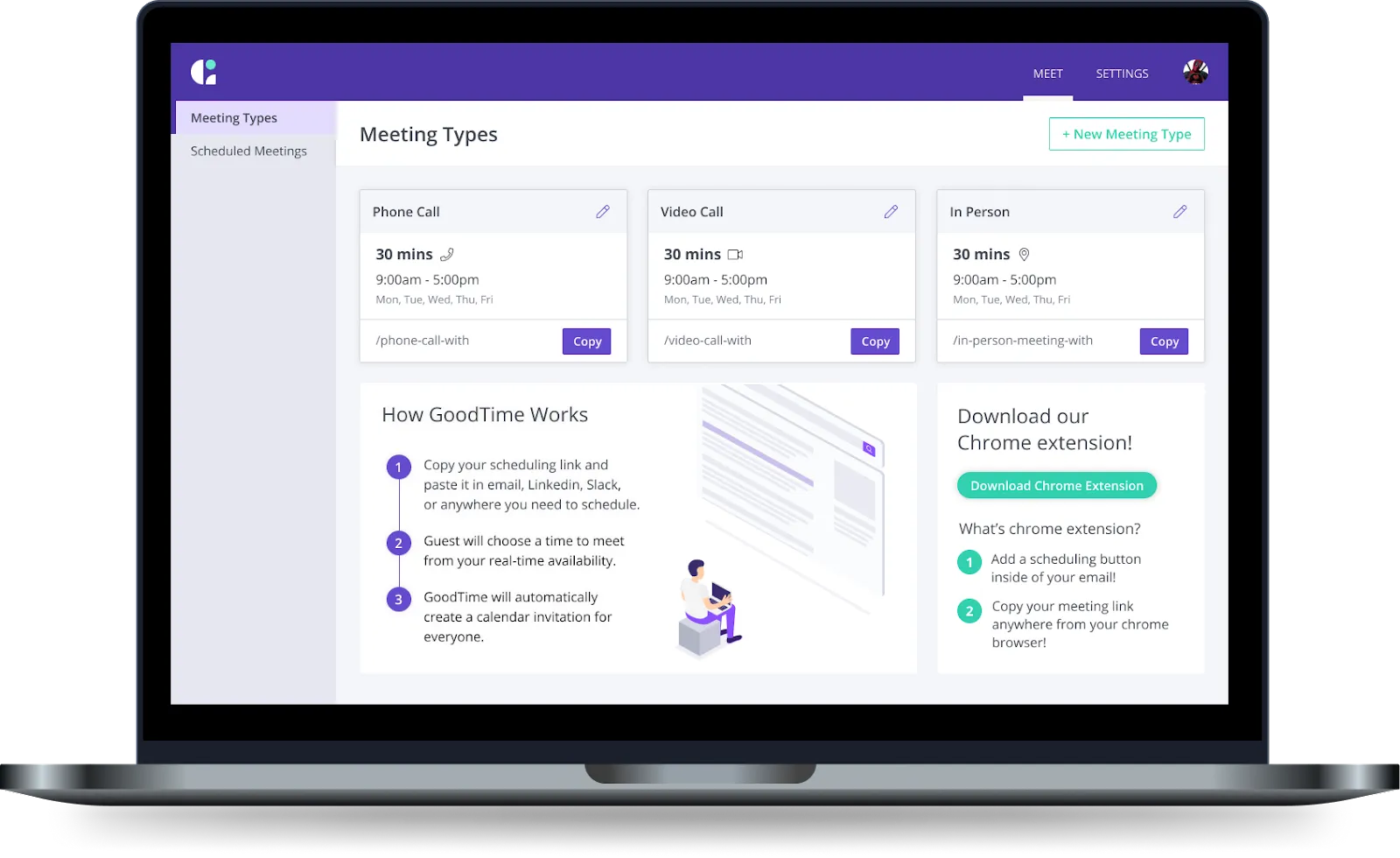 Características: GoodTime Meet é uma ferramenta incrível para empreendedores e profissionais de negócios coordenarem facilmente a disponibilidade de seus calendários com apenas um clique.