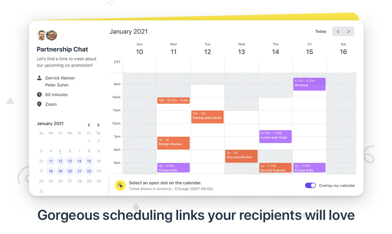 Há muitos recursos impressionantes a serem apreciados no SavvyCal. Isso inclui a funcionalidade de sobreposições de calendário, a apresentação das janelas de disponibilidade em uma ordem específica, a capacidade de personalizar em tempo real e muito mais.