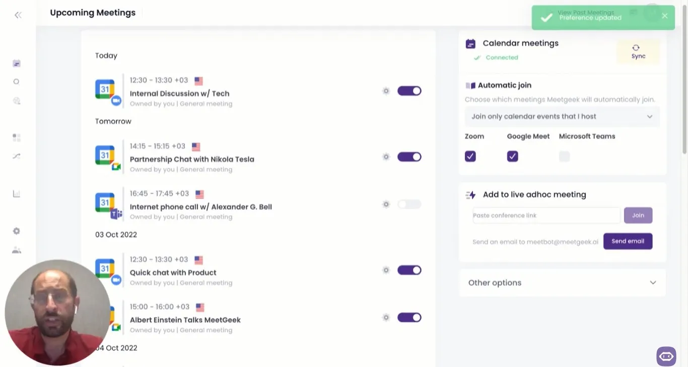 O MeetGeek permite que você acesse todas as suas reuniões anteriores em um só lugar, incluindo as atas das últimas reuniões, participantes, data e hora e qualquer outra coisa que você possa ter perdido.