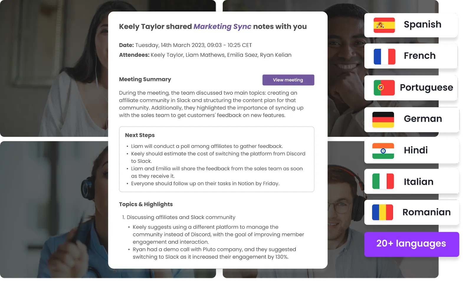 A boa notícia é que o MeetGeek usa algoritmos avançados de IA para gerar transcrições precisas em mais de 50 idiomas, para que você possa ter reuniões bem-sucedidas, não importa onde esteja.