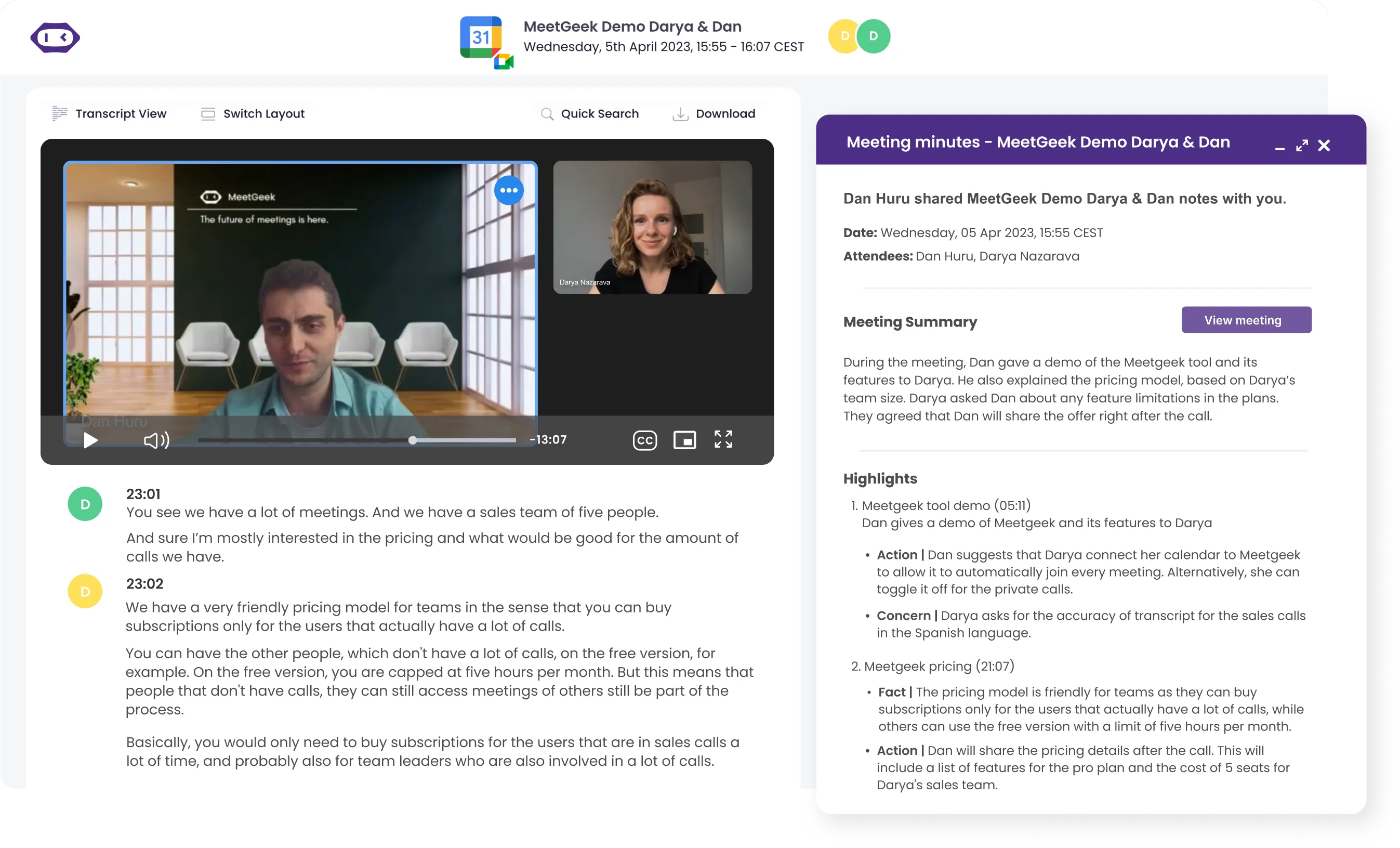 Ao entrar em contato com clientes em potencial, a comunicação eficiente é fundamental. É por isso que você precisa garantir que esteja 100% presente e que seus clientes se sintam ouvidos. Nosso assistente virtual de reuniões com IA Conheça o Geek foi projetado especificamente para permitir que você se concentre em suas reuniões enquanto as grava, resume e transcreve automaticamente.