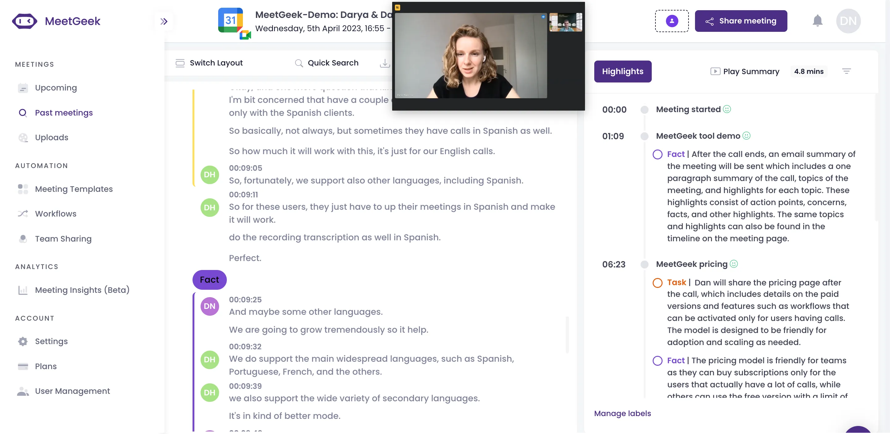 Para que as reuniões continuem em andamento, você deve reduzir ao mínimo todos os obstáculos e interrupções. Como sabemos que nem sempre é fácil, Conheça o Geek está aqui para ajudar. Nossa ferramenta foi projetada para ajudar você a se concentrar nas metas da reunião, ao mesmo tempo em que grava, resume e transcreve automaticamente suas reuniões.