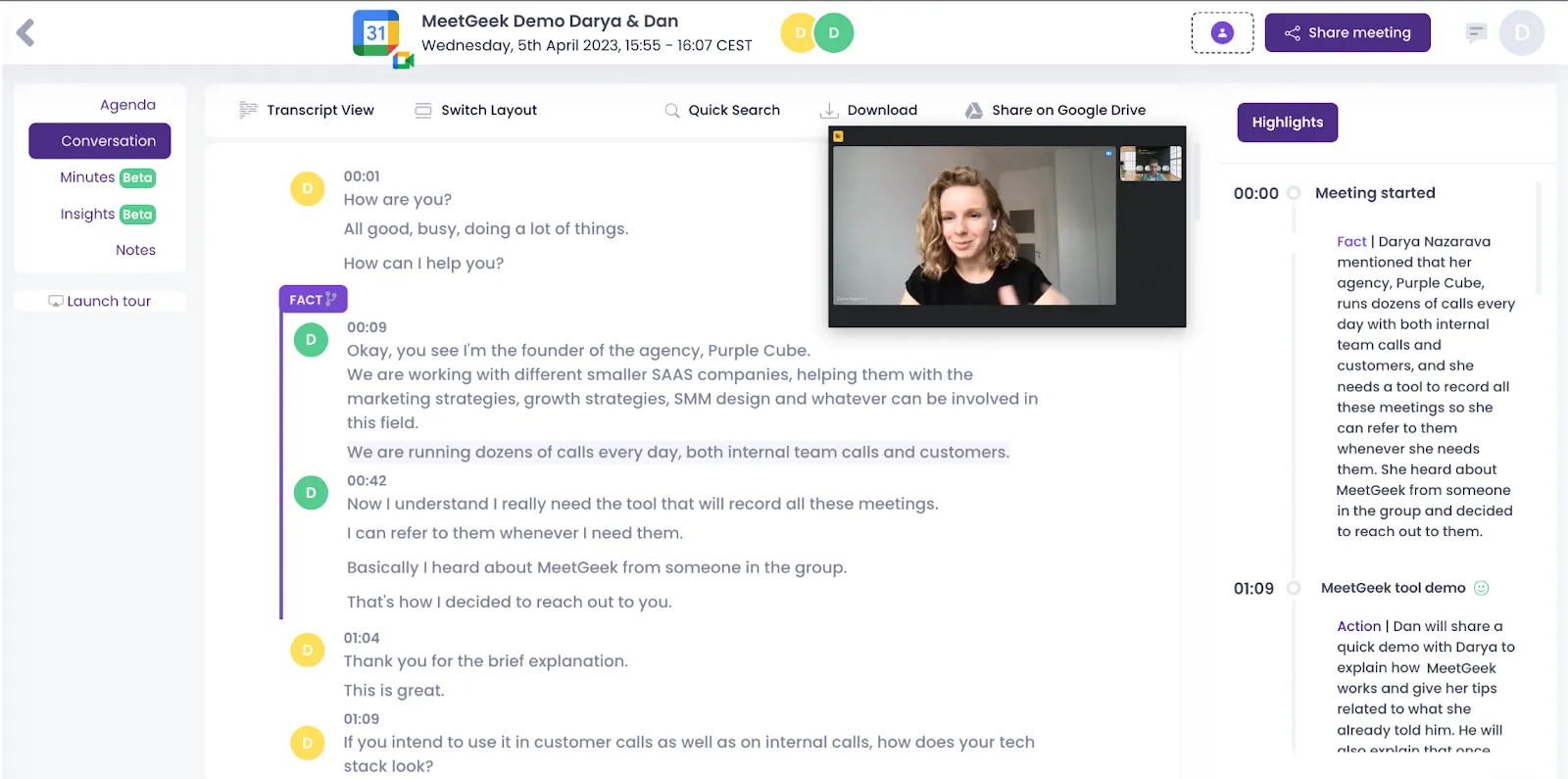 Com Conheça o Geek, você não precisa mais se preocupar em esquecer detalhes importantes de suas reuniões. Ele grava e transcreve automaticamente suas reuniões e até extrai os principais pontos, perguntas e comentários usando as palavras-chave que você fornece.
