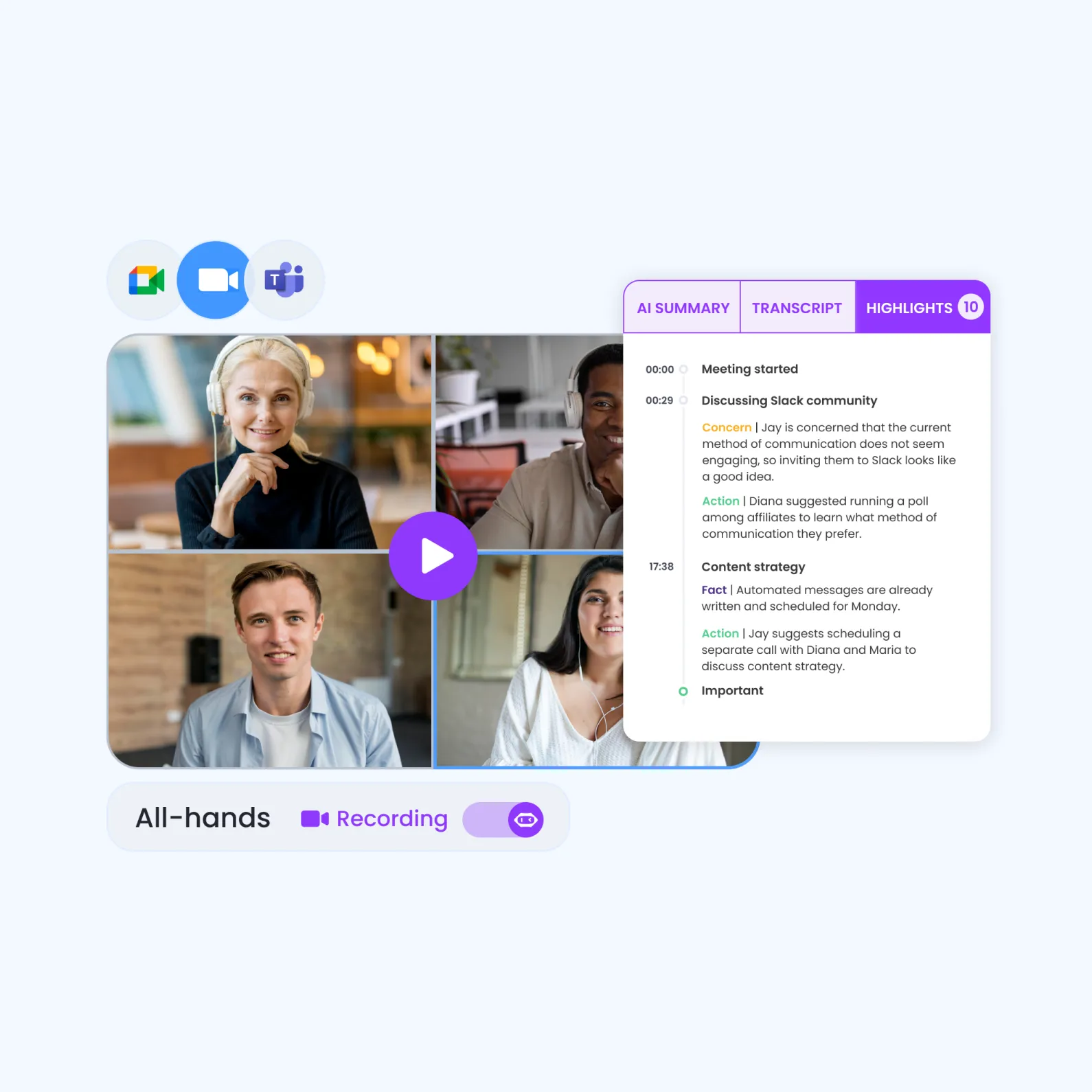 From demo calls to customer testimonials, centralize every record with your users and clients in one unified meeting hub.