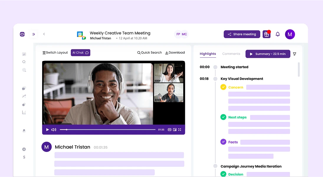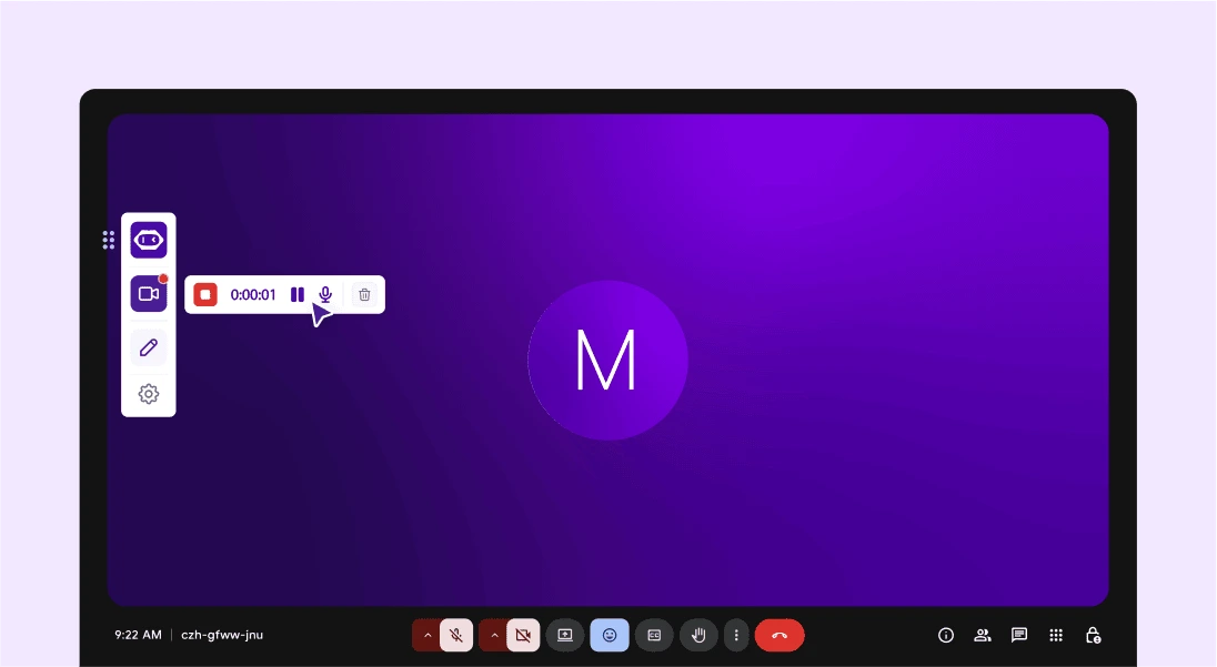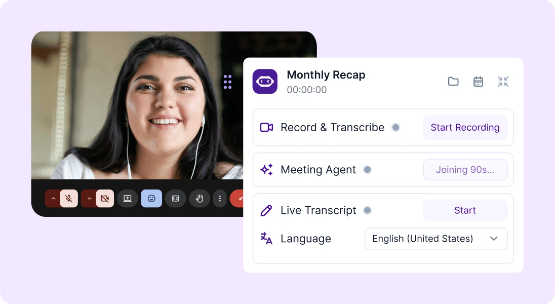 Capture full video, screen sharing, and camera feed automatically during meetings. Use this when you want the full visual context, not just audio and you can turn it on or off anytime.