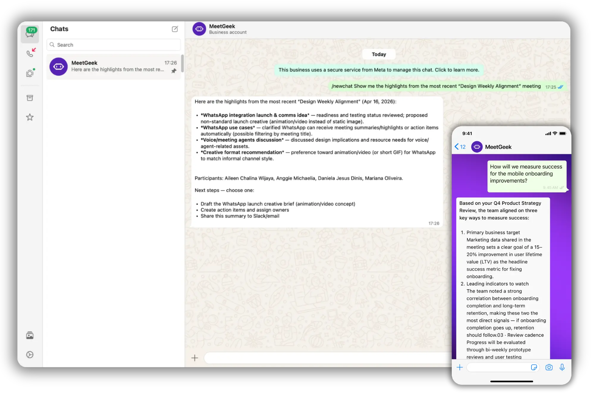 The MeetGeek + WhatsApp integration turns WhatsApp into a mobile command center for your meetings, delivering insights and letting you take action right from your chat.